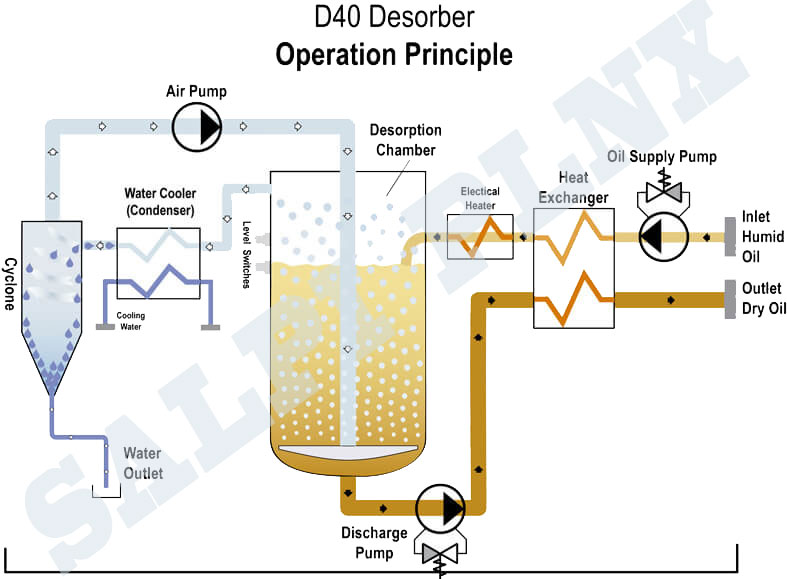 Десорбер может осушить масло до содержания воды менее 200 частей на миллион, удаляя до 8 л воды в час в зависимости от типа масла.